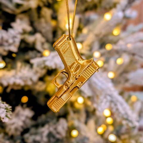 This detailed golden pistol ornament looks like a tiny replica of a real handgun—fun, unique, and guaranteed to spark conversation. Whether you're a firearm enthusiast, a collector, or shopping for the perfect stocking stuffer, this gun ornament makes a memorable holiday gift.