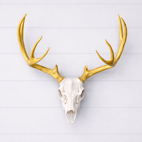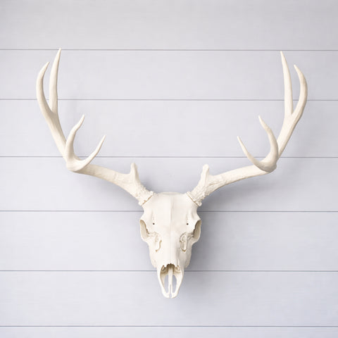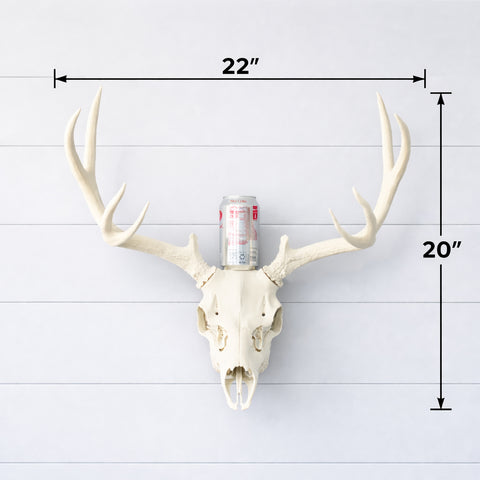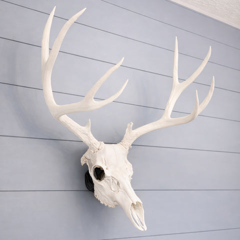 Measuring approximately 22 inches wide (antler tip to tip) and 24 inches tall, this life-size replica creates a striking focal point. The matte white finish highlights fine detail while blending seamlessly into modern farmhouse, rustic, western, lodge, Scandinavian, and minimalist interiors and even gothic decor.